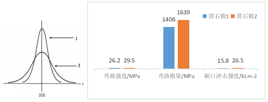 對一個滑石產品細度優劣的評價不能僅憑平均粒徑D50一個指標,至少需有平均粒徑D50和最大粒徑D98(或D100)兩指標。其平均粒徑不但要符合要求,更重要的是粒徑分布應盡量窄,大顆粒盡量少。下圖為兩個平均粒徑相同但不同粒徑分布的產品。產品1的粒徑分布較窄、最大粒徑較小,產品的粗顆粒較少;而產品2的粒徑分布較寬,最大粒徑較大,產品的粗顆粒多。在其他條件相同的情況下,產品1改性的性能好于產品2。粗顆粒的大小和多少對產品的機械性能產生顯著不利影響,需要嚴格控制。