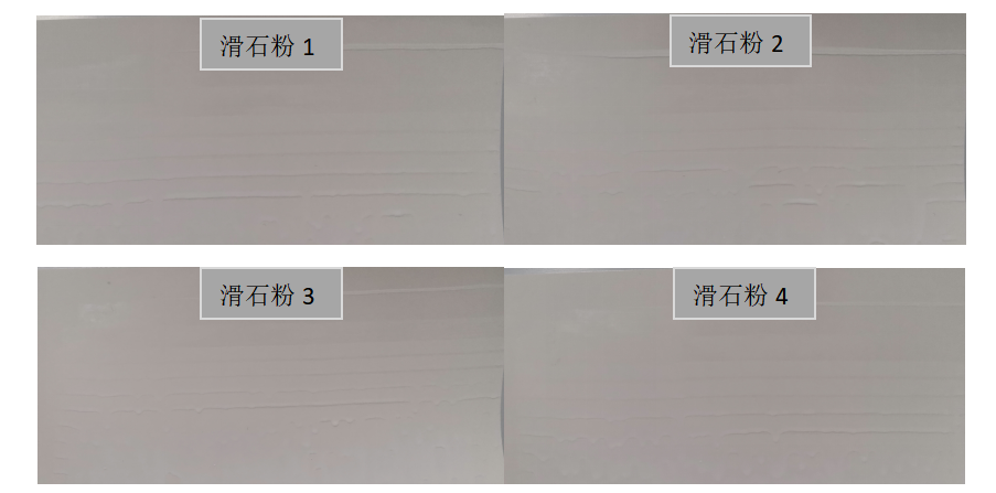 下圖為我司不同礦源的滑石粉在內墻乳膠漆中的對比情況;由下圖可以發現滑石粉1粘度低,但其具有較優異的流變TI指數,說明在配方使用滑石粉1可以使產品具有更寬的施工范圍,以及更優異的施工抗流掛性;其他滑石粉則有粘度更高而觸變性更低等的情況。